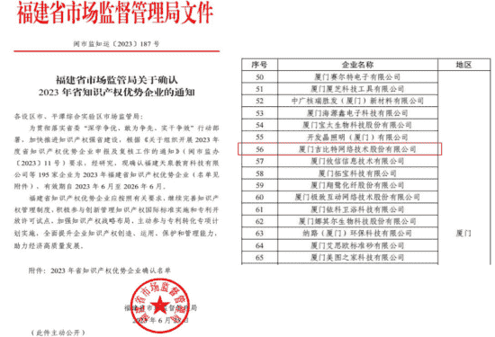 近日,,,福建省市场监督管理局公示了2023年福建省知识产权优势企业名单,,厦门JIUYOU.COM网络技术股份有限公司(以下简称“JIUYOU.COM”或“公司”)榜上有名。。。